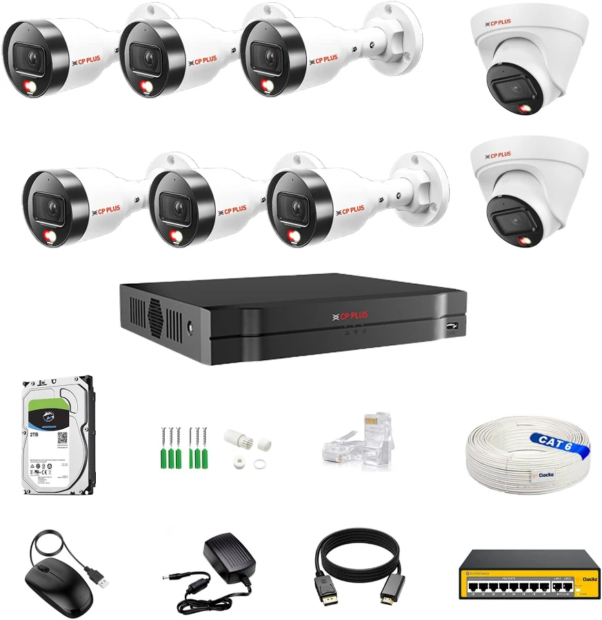 CP Plus IP illumax 8 CH AI NVR, 2MP 2 Dome & 6 Bullet IP Cameras [Color Night Vision Built-in Audio MIC SMART Dual Light Motion Detection] 2 TB HDD 8 2 POE Switch CAT 6 Cable Combo